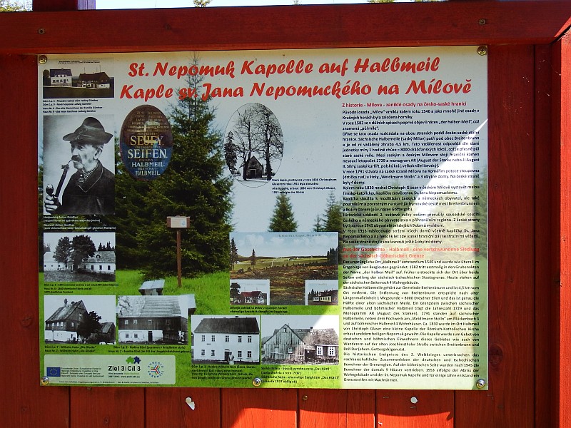 . Mílovská spojka nás dovede ke kapličce v bývalé hornické pohraniční osadě Mílov. Obec vznikla v 16. století a zničena byla v roce 1953.