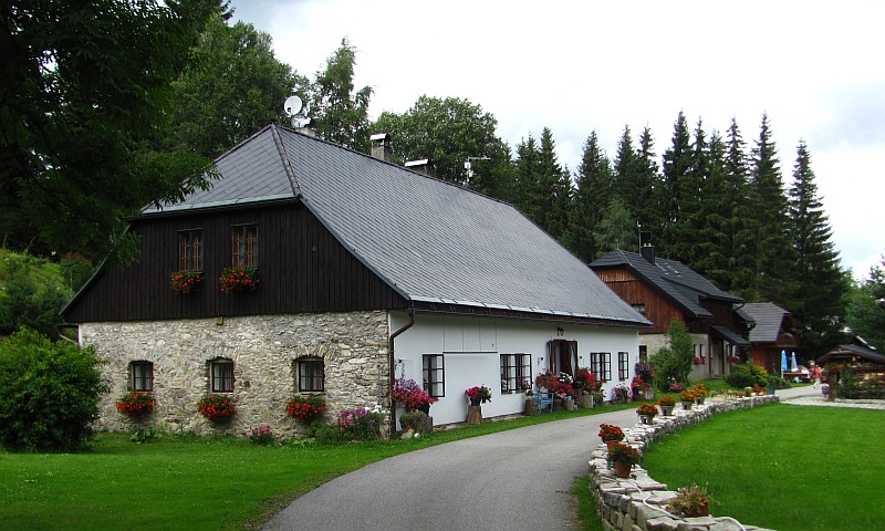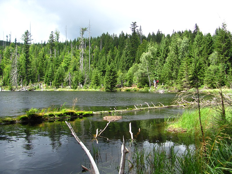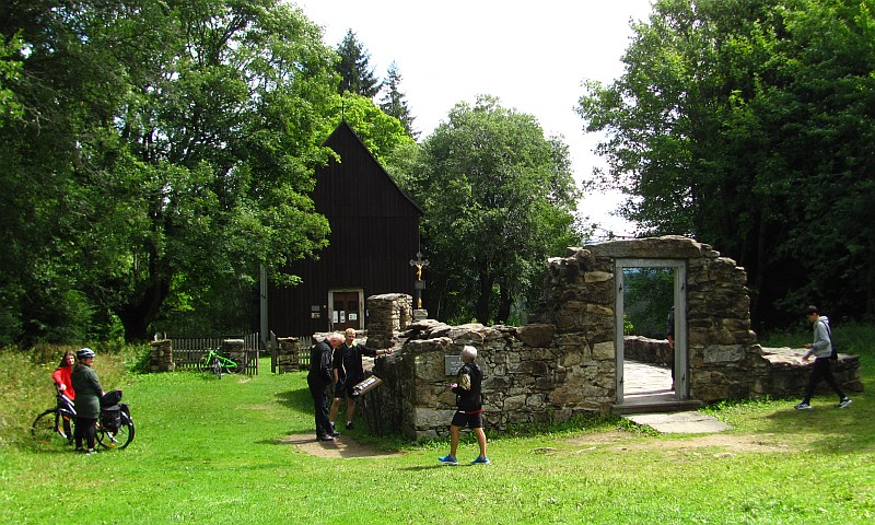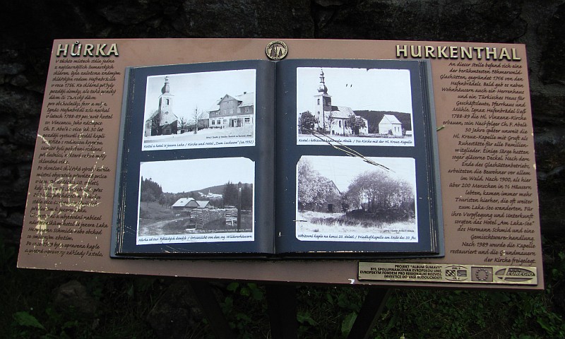 Asi v polovině cesty k jezeru přicházíme k místu, kde stávala sklářská ves Hůrka, nyní jsou zde jen pozůstatky stavení a kaple, která byla obnovena a vysvěcena v roce 2002. Můžeme se zde dozvědět i něco o historii tohoto místa ...