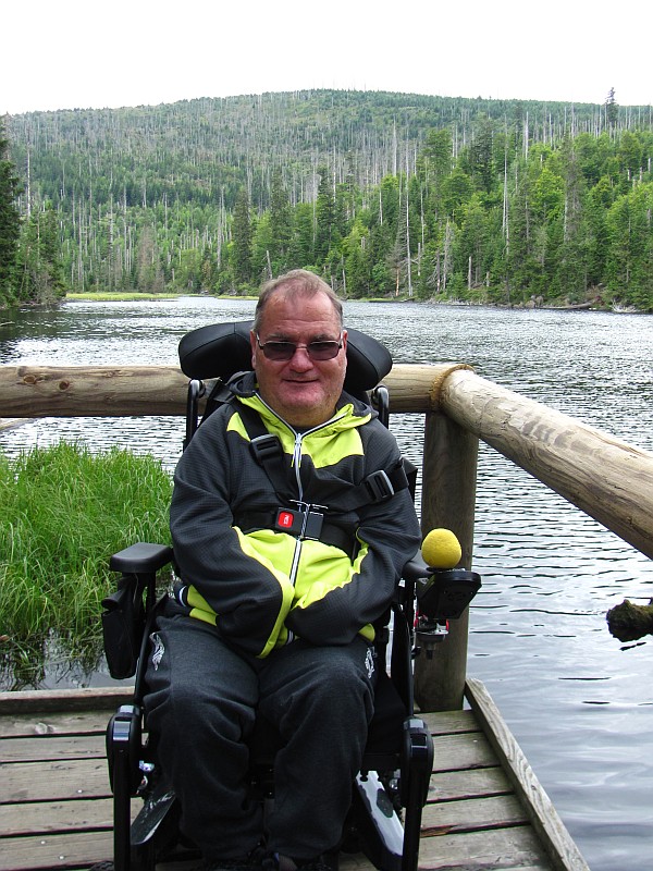 S elektrickým vozíkem se poté dostaneme až na dřevěnou vyhlídkovou plošinu přímo na kraji jezera, odkud je na něj krásný výhled.